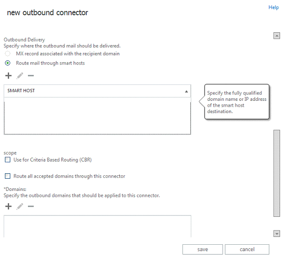 7) Scroll down the “new outbound connector” window. Under Domains, click the “+” button to add a new domain for the connector. The “add domain” window will appear.