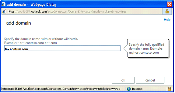 8) On the “add domain” window, enter the fax domain for ExtraFax (This is the fax domain specified during the ExtraFax Initial System Setup). Click OK.