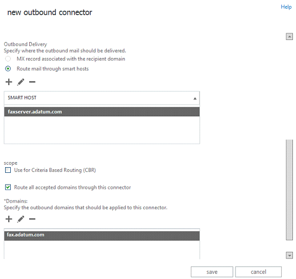 9) Check the option “Route all accepted domains through this connector". The completed “new outbound connector” window should look like the following: