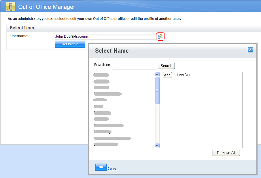 The OOO.ntf template incorporates a majority of all the user interface features of the Out of Office XPages Web App. The extended template OOOEx.ntf includes an additional feature which is a name picker control that allows an administrator user to select a user name from the Domino Directory instead of having to type the name.