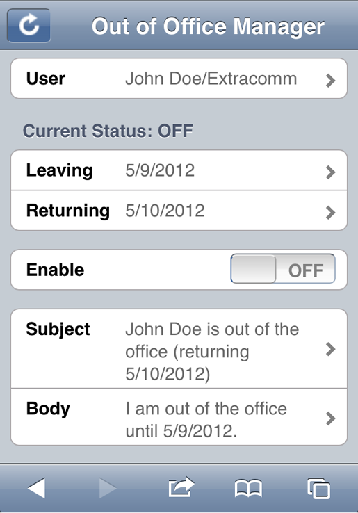 XPages Mobile controls in Domino 9.0.1 Fix Pack 2 and earlier releases do not work with iOS 8. As a result, the Out of Office XPages Web App may not work properly on iOS 8 devices.
