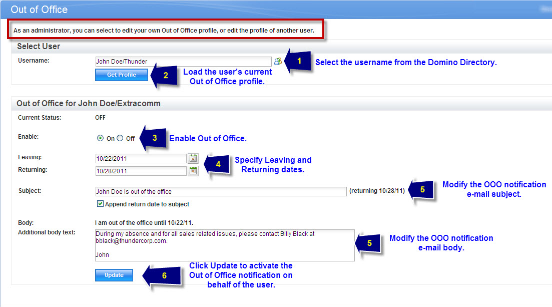 3) If you have been assigned the Admin ACL role in OOO.nsf, you are allowed to configure and enable the Out of Office profile for other users and thus the "Select User" section will be available.